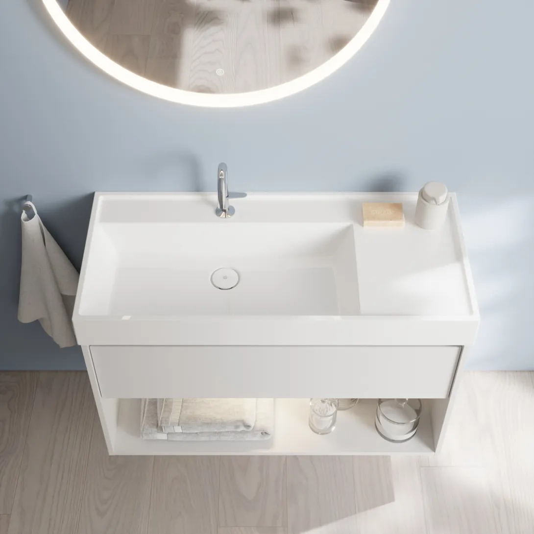 Die Serie ist so konzipiert, dass sie sowohl im Neubau als auch bei Renovierungsprojekten eingesetzt werden kann. Praktische Lösungen wie optional nachrüstbare Beleuchtung oder flexible Stauraumkonzepte unterstützen eine unkomplizierte Umsetzung.