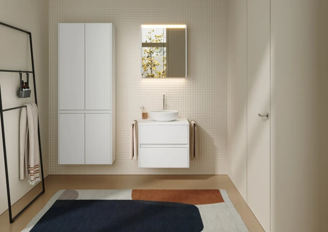 Oteo wurde gezielt auch für kleinere Räume entwickelt und entfaltet gerade dort seine Wirkung. Die Serie bietet eine durchdachte Lösung für kompakte Badezimmer und kombiniert platzsparende Planung mit einem auffälligen Designcharakter.
