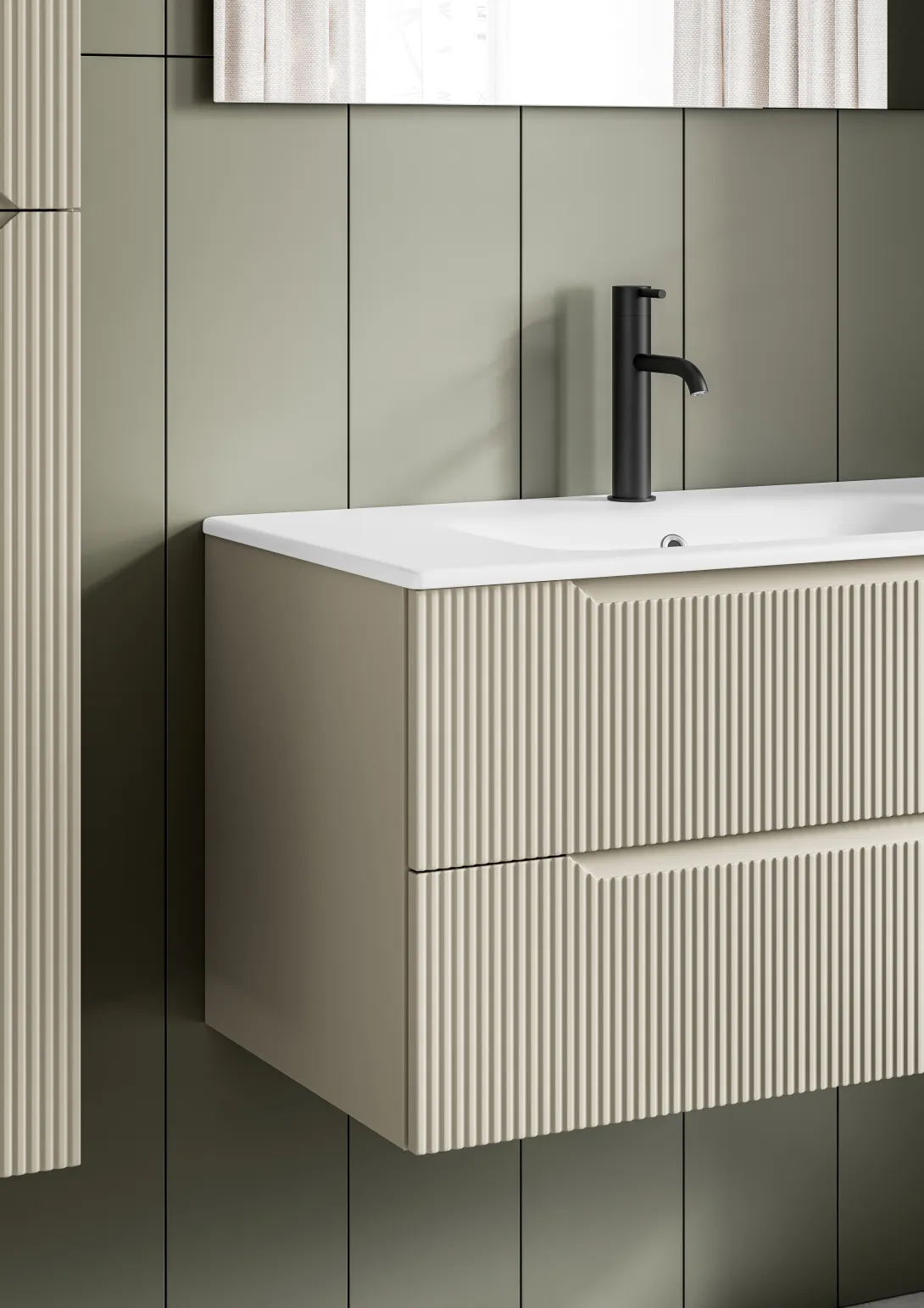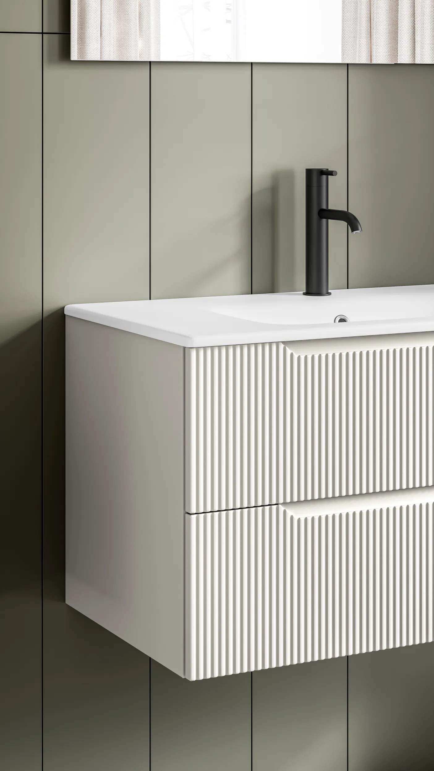 Die Badmöbelserie .Bravo verleiht dem Badezimmer mit seiner markanten geriffelten Frontstruktur und den grafisch integrierten Griffmulden einen einzigartigen Charakter. Eine Serie, die modernes Design mit hoher Alltagstauglichkeit verbindet.