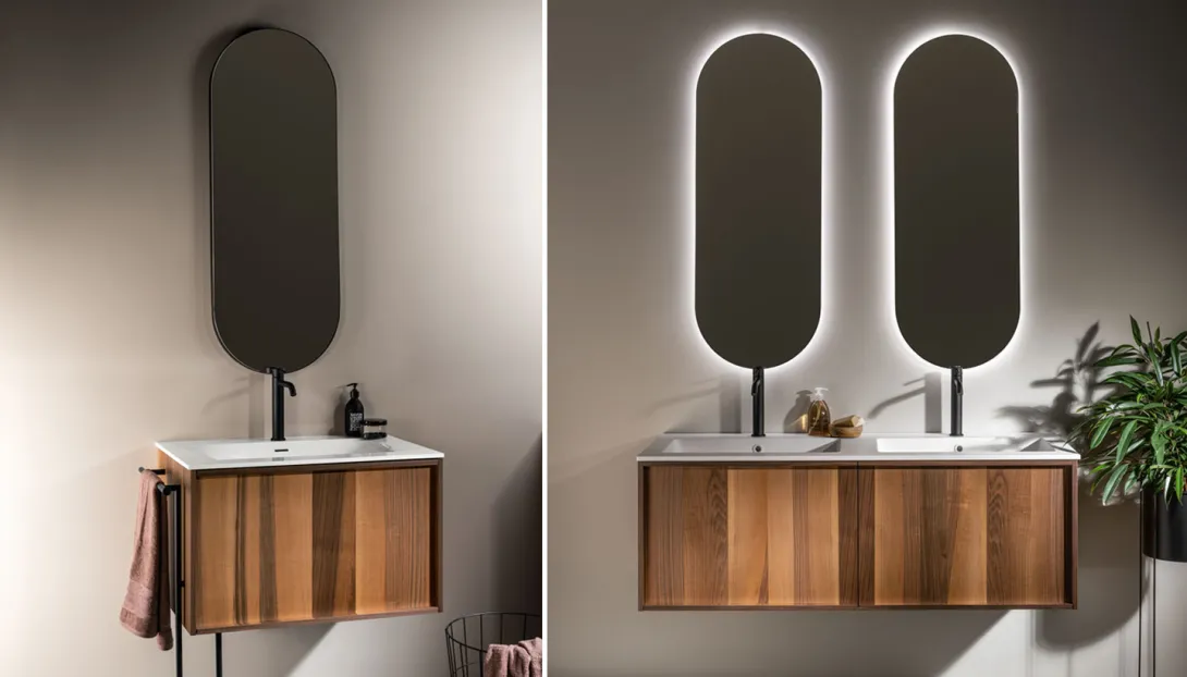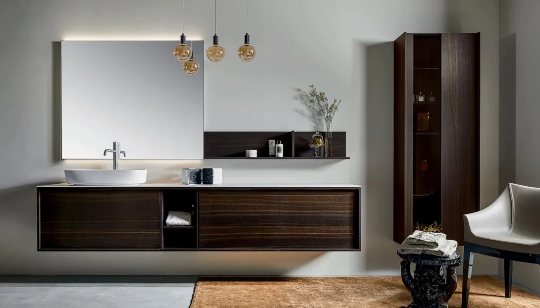 Langer, freischwebender Waschtisch aus dunklem Holz mit rundem Spiegel und minimalistischer Armatur in modernem Badezimmer von Stocco.