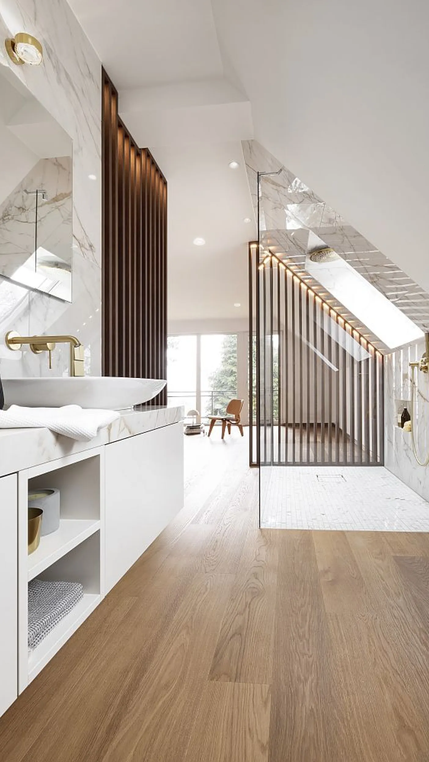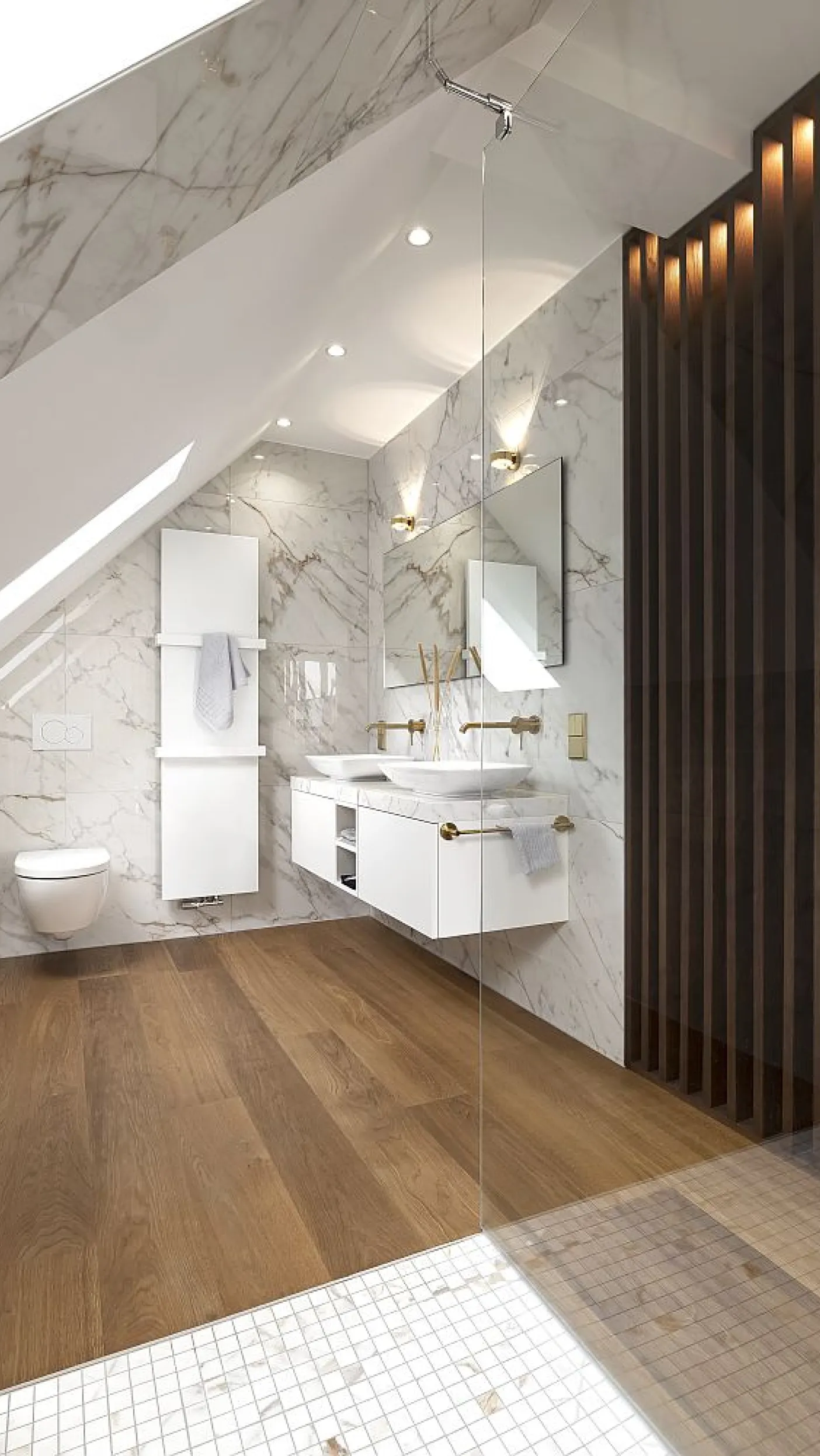 Luxuriöse En suite-Lösung im Odenwald: Schlafzimmer und Dachbad in Holzoptik