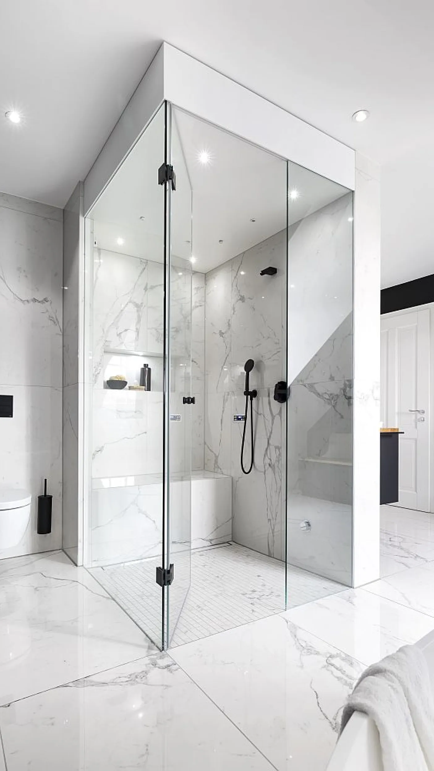 Besonders edel sind die großflächigen Feinsteinzeug-Fliesen am Boden und in der Dampfdusche. Die verblüffend echt aussehende Marmortextur wirkt nicht nur besonders nobel, sondern bringt auch wohltuende Ruhe ins Badezimmer. Die helle Farbgestaltung und die ebenmäßigen Flächen fügen sich da ideal ein.